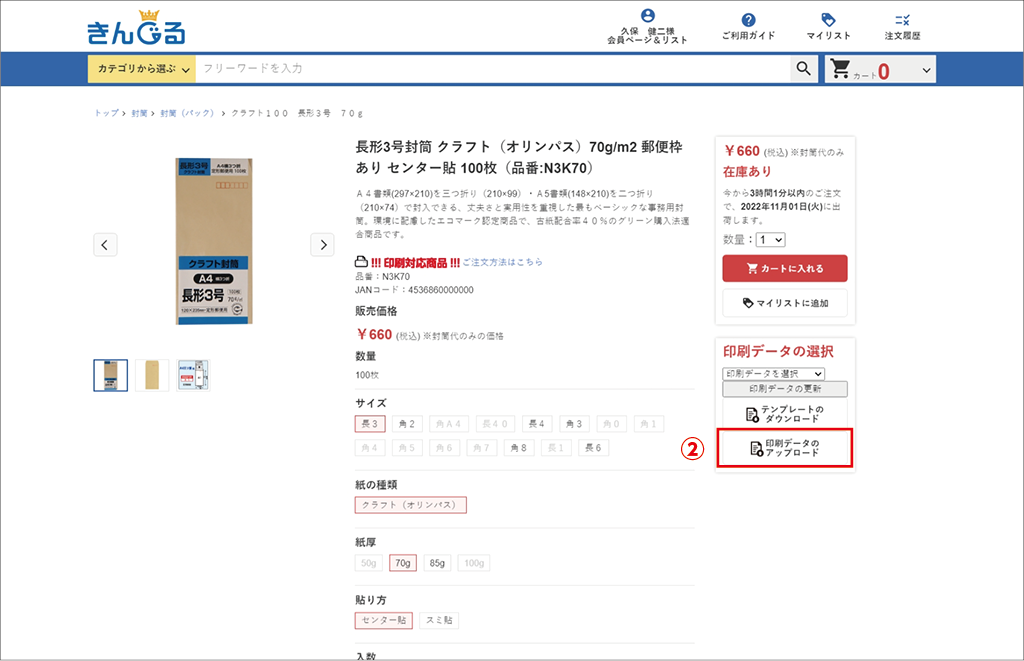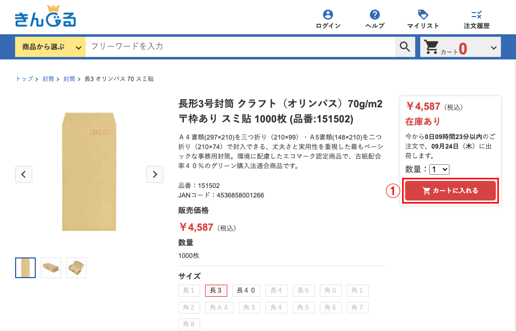 (1)商品詳細ページで、数量を指定して【①カートに入れる】をクリックしてカートへ入れてください。