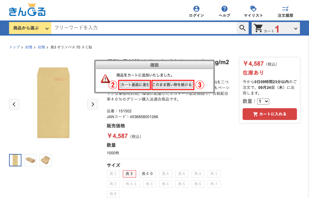 (2)確認ダイアログが表示されるので、【②カート画面に進む】をクリックしてください。