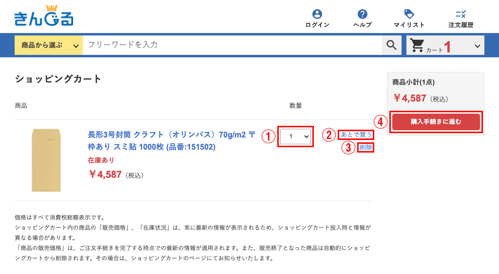 カートの内容に問題が無い事が確認できたら【④購入手続きに進む】をクリックしてください。