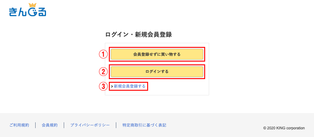 【①会員登録せずに買い物する】をクリックし、画面の指示に従ってお買い物を進めてください。