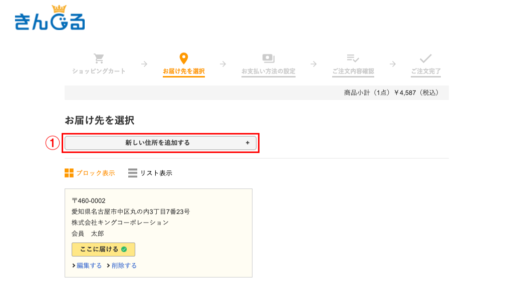 お届け先を登録されていない方、もしくは一覧にご希望の住所が無い場合は、【①新しい住所を追加する】をクリックして新しい住所を追加してください。
