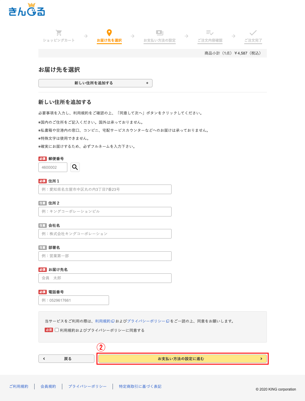 お届け先情報をご入力し、【②お支払い方法の設定に進む】をクリックしてください。