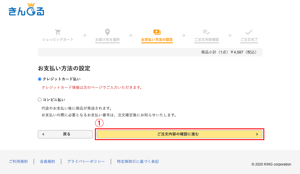 お支払い方法を選択いただき、【①ご注文内容の確認に進む】をクリックしてください。