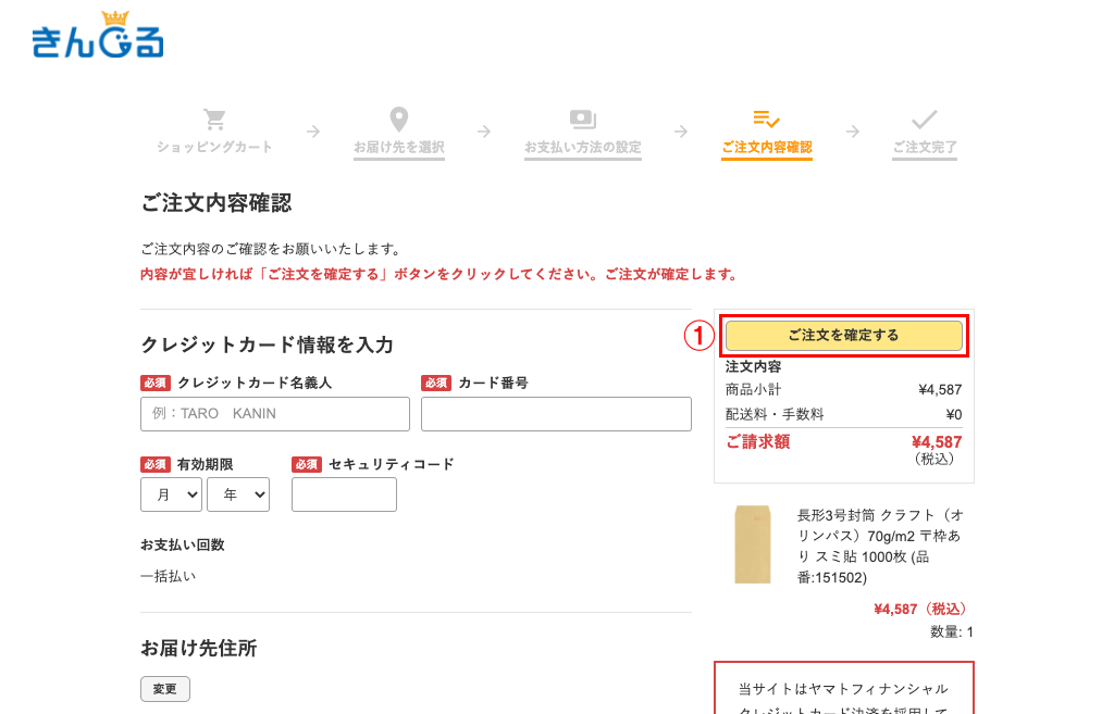 ご注文内容をご確認いただき、問題がなければ【①ご注文を確定する】をクリックしてください。