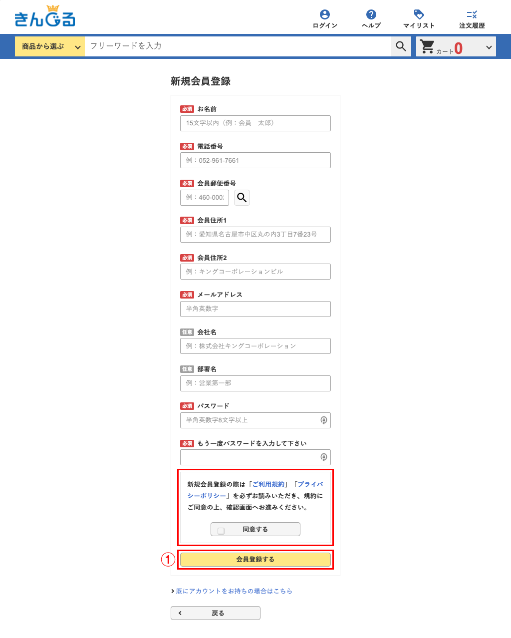 (1)新規会員登録ページで各項目に必要情報を入力し、ご利用規約と個人情報保護方針をお読みいただき、【①会員登録する】をクリックします。