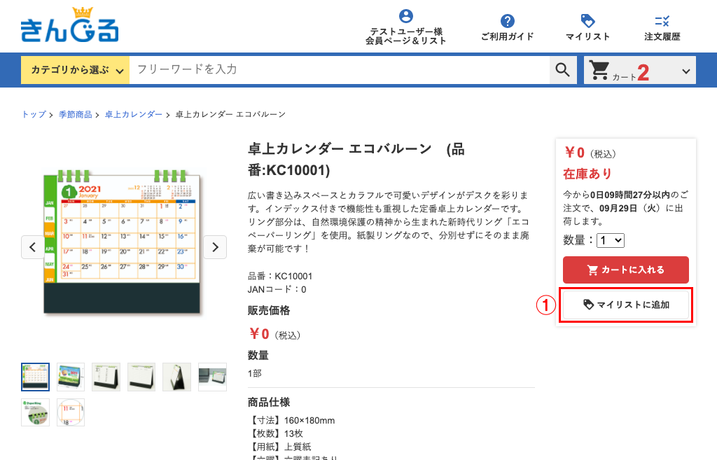 (1)商品詳細ページの、『①マイリストに追加』をクリックすると、マイリストに追加する事ができます。